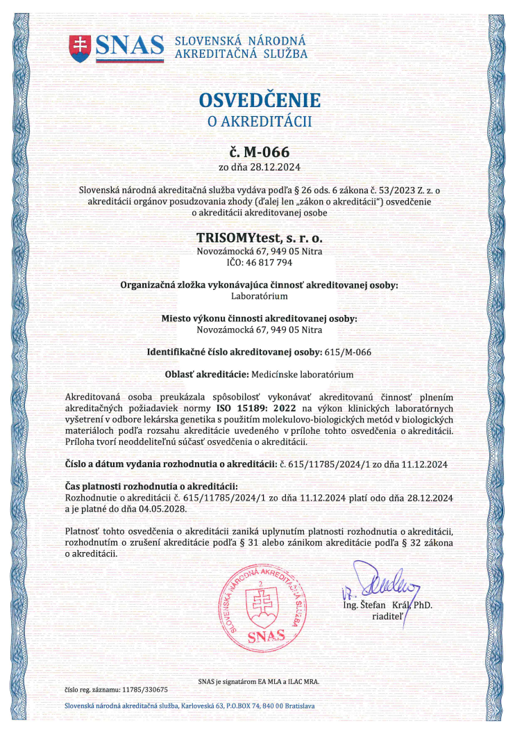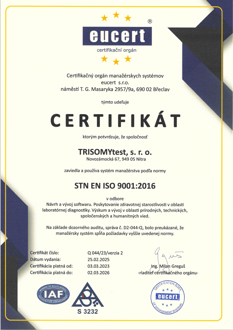 Softvér spoločnosti TRISOMY test je zaradený do triedy bezpečnosti C v súlade s legislatívou pre in vitro diagnostické zdravotnícke pomôcky (IVD ZP). Spĺňame všetky základné požiadavky na bezpečný a spoľahlivý výkon, potvrdené úspešným externým auditom podľa normy ISO 13485, bez zistených nezhôd.